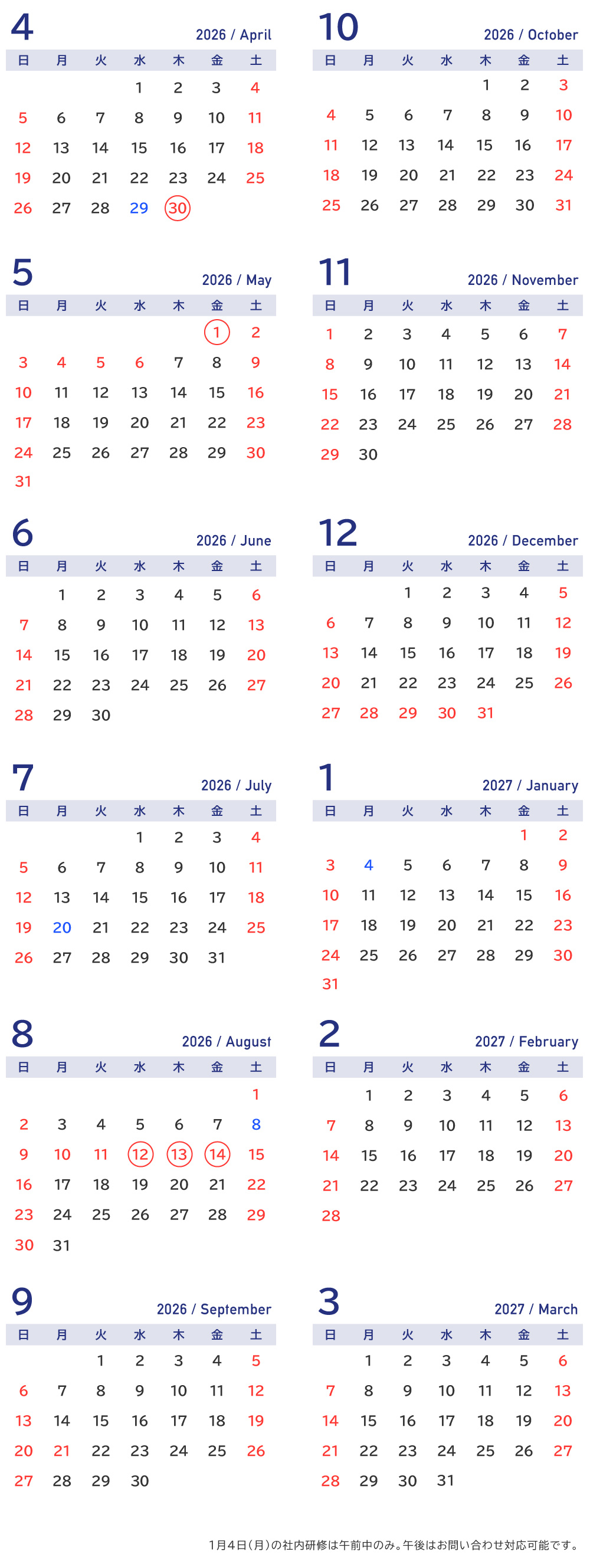 2026年度 営業日カレンダー営業日(黒文字)と、休業日(赤文字・〇で囲まれている日程は計画年休)と、社内研修日(青文字)をお知らせします。 誠に勝手ながら、休業期間中および社内研修日に頂きましたご質問やご意見への回答は翌営業日の受付とさせて頂いておりますので、よろしくお願い申し上げます。 ![]() |
